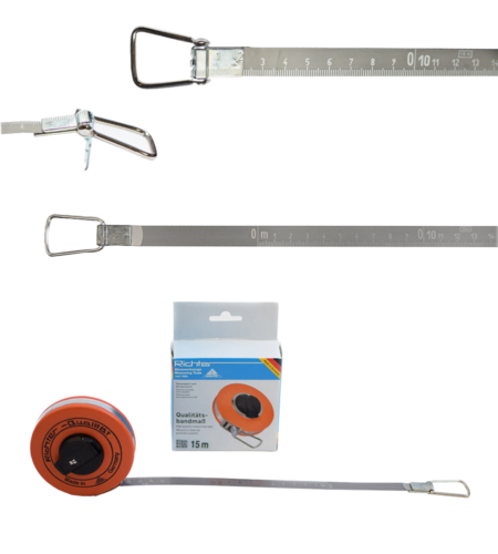 Stalowa taśma niemieckiej firmy RICHTER 358P 15m w kapslu, wykonana z niełamliwego i odpornego na korozję stopu stali. Podziałka trawiona w stali.