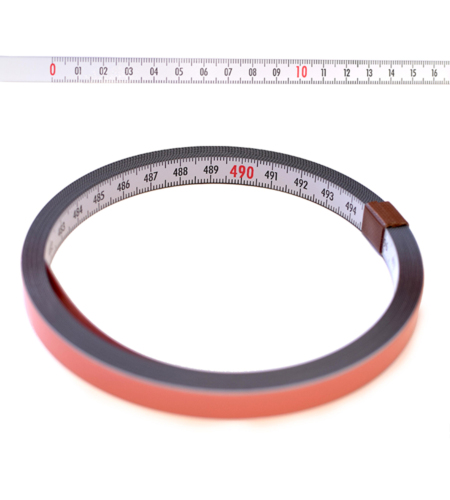 Skala na taśmie idąca od lewej do prawej strony. Podział milimetrowy w kolorze czarnym, umożliwia dokonanie dokładnych pomiarów. Dodatkowo decymetry oznaczone są w kolorze czerwonym. Taśma lakierowana w kolorze białym.