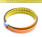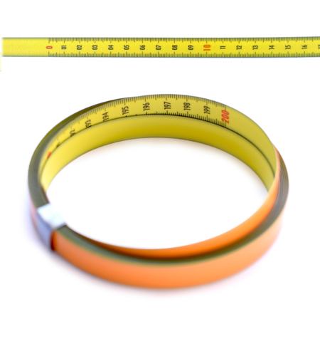 Skala na taśmie idąca od góry do dołu. Podział milimetrowy w kolorze czarnym, umożliwia dokonanie dokładnych pomiarów. Dodatkowo decymetry oznaczone są w kolorze czerwonym. Taśma pokryta poliamidem w kolorze żółtym.