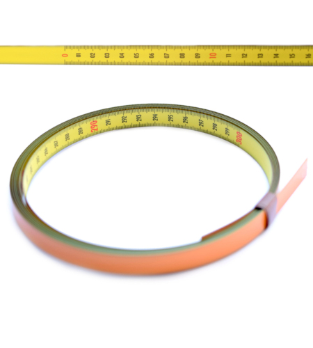 Skala na taśmie idąca od góry do dołu. Podział milimetrowy w kolorze czarnym, umożliwia dokonanie dokładnych pomiarów. Dodatkowo decymetry oznaczone są w kolorze czerwonym. Taśma pokryta poliamidem w kolorze żółtym.